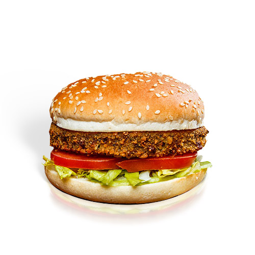 Vollkorn-Rustica Bun, Gemüseschnitzel (70g), Käse, Gewürzgurken, Tomate, Zwiebeln, Eisbergsalat und Haussauce